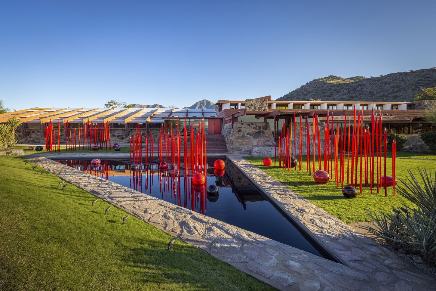 Chihuly in the Desert umfasst sechs Kunstinstallationen im Taliesin West, die im Gebäude, auf den Außenflächen, im Wasser und in der Sonora-Wüste selbst platziert sind. Jede Installation stellt einen Dialog zwischen Wright und Chihuly dar, der die Werke der beiden Meister auf eine noch nie dagewesene Weise miteinander verbindet. Taliesin West ist das Winterquartier und Wüstenlabor des großen Architekten, eine ideale Kulisse für die Erforschung der Elemente und Gestaltungsprinzipien, die sowohl in Chihulys Skulpturen als auch in Wrights Architektur zu finden sind. Zu den Werken gehören die Alabaster- und Bernsteinspitztürme am Eingangsplatz, rotes Schilf und Niijima-Schwimmer am vorderen Teich, schwarze Saguaros und scharlachrote Eiszapfen auf dem Studiorasen, goldene Celedon-Körbe im Gartenzimmer, feuerbernsteinfarbene Reiher am Turmbecken und marineblaue und zitronenfarbene Türme an den Gartenplätzen.