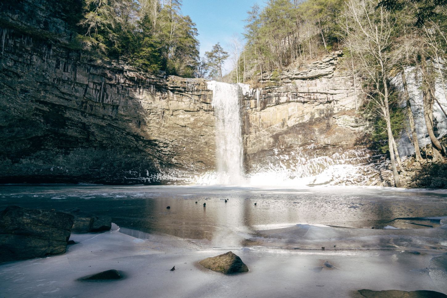 Foster Falls im Winter - Marion County, Tennessee Der Great Smoky Mountains National Park im Osten des Staates ist der meistbesuchte Nationalpark der USA. In seinem 2000 Meter hohen Mittelgebirge leben Bären und überdauern Hütten der Pioniere. Mehr als 1000 Kilometer Wanderwege durchziehen das Biosphärenreservat der Vereinten Nationen und UNESCO-Weltkulturerbe.