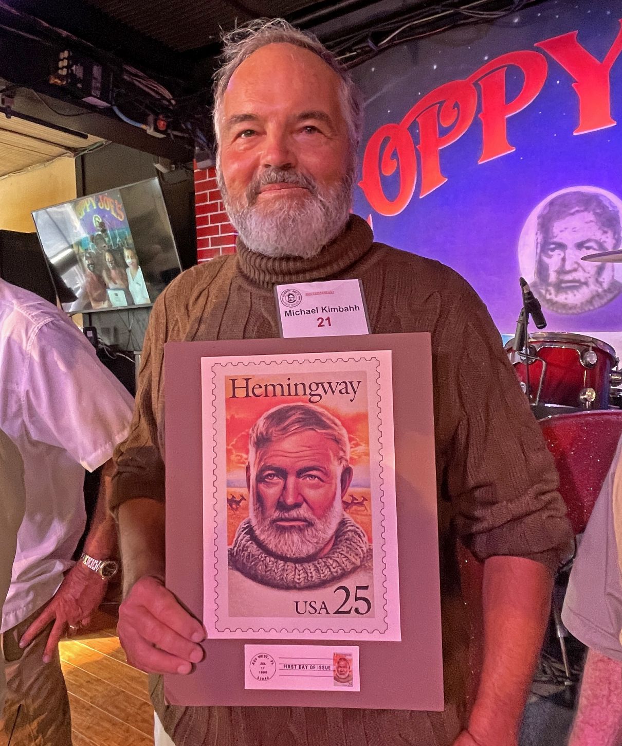 Michael Kimbahh hält ein vergrößertes Faksimile einer Ernest Hemingway-Briefmarke in der Hand, um seine Ähnlichkeit beim Hemingway Look-Alike Contest zu demonstrieren.Hemingway Days – 19. bis 24. Juli 2022