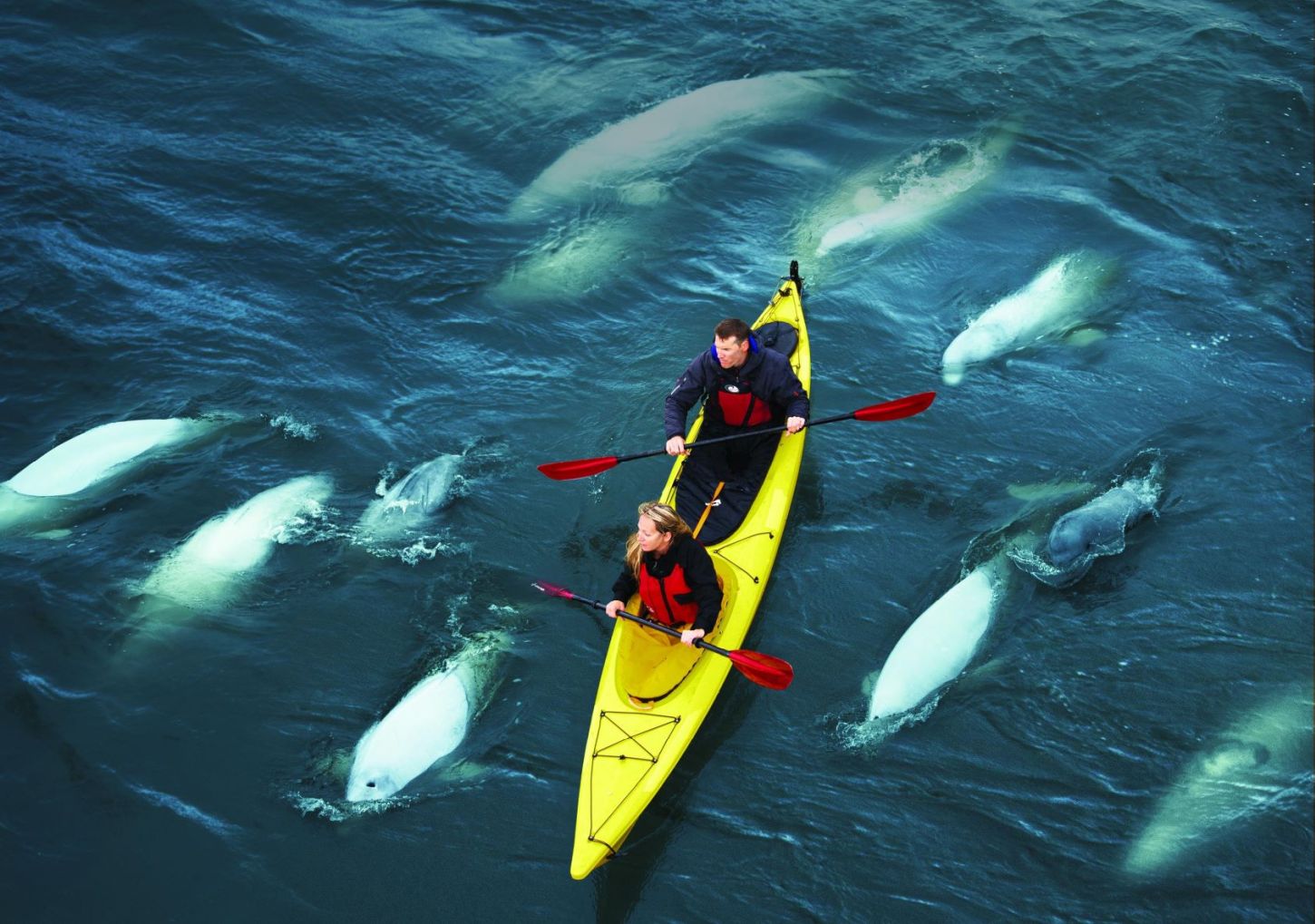 Mit dem Schlauchboot kommt ihr den gutmütigen Walen noch ein Stückchen näher. Nehmt an einer Paddeltour mit dem Kajak teil, wenn ihr die Wale lieber ohne den störenden Motorenlärm erleben möchter. Und wenn euch das kalte Wasser der Hudson Bay nichts ausmacht, könnt ihr das Beluga AquaGliding™ von Lazy Bear Expeditions ausprobieren. Geschützt durch einen wärmenden Neoprenanzug könnt ihr den Walen ganz nahe kommen - sie sind neugierig, schwimmen sicher um euch herum und schenken euch ihr freundliches "Beluga-Lächeln".