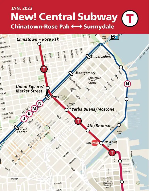 Das öffentliche Nahverkehrsnetz von San Francisco hat nun mit Chinatown/Rose Pak, Union Square/Market Street, Yerba Buena/Moscone und 4th/Brannan Station vier komplett neue Metro-Stationen. Diese werden in den Fahrplan der bereits bestehenden roten T Third-Linie eingebaut. Ihr Streckenverlauf ändert sich ab der Haltestelle 4th & King. Statt über Embarcadero fährt die T Third-Linie ab sofort die neuen Haltestellen an – ihr Endziel ist nun Chinatown. Dank dieser Verbindung sparen sich Urlauber und Pendler rund 20 Minuten Reisezeit zwischen den geschäftigen und beliebten Vierteln in Downtown und Mission Bay.