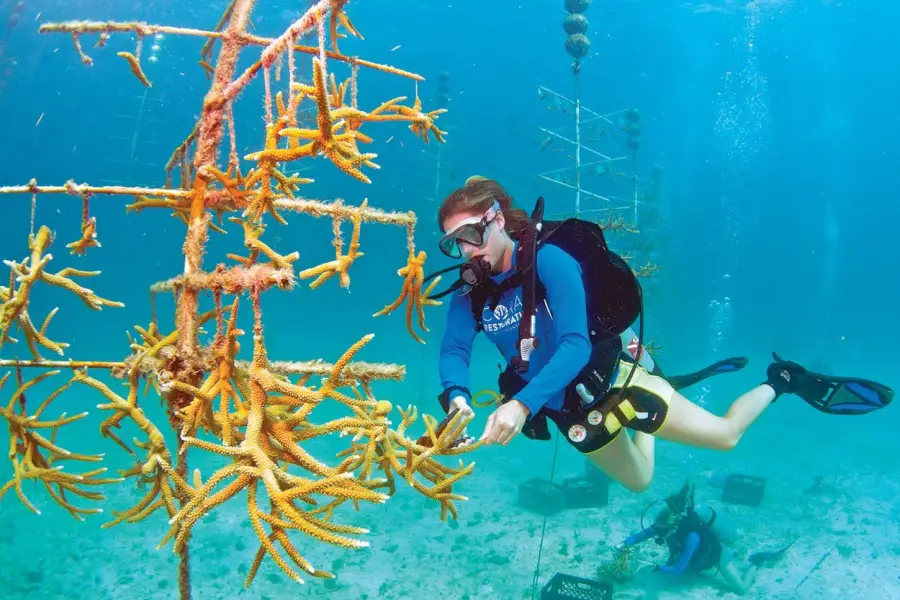 Die Coral Restoration Foundation in Key Largo bietet in Zusammenarbeit mit verschiedenen Tauchanbietern regelmäßig ganztägige Programme zum Mitmachen an. Nach einem theoretischen Teil am Vormittag geht es ins Meer, wo bei einem Tauchgang zu den Korallenaufzuchtstationen die Korallenbäumchen gereinigt, beschnitten und für die Auspflanzung vorbereitet werden.