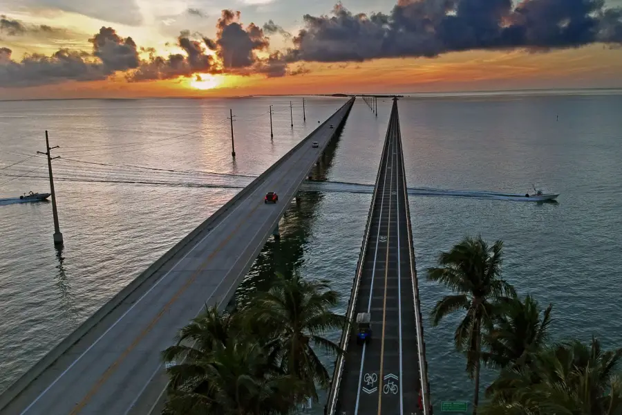 Die Florida Keys beginnen südlich von Miami und sind durch die 42 Brücken des Overseas Highways miteinander verbunden. Sie führen über den Atlantik, die Florida Bay sowie den Golf von Mexiko und bilden die südlichste Etappe des U.S. Highway 1, auch bekannt als „Highway that Goes to Sea" – eine legendäre Fahrt, die jeder einmal erlebt haben sollte. Einer der Höhepunkte ist die Seven Mile Bridge, die sich knapp sieben Meilen (rund elf Kilometer) über das offene Meer erstreckt.