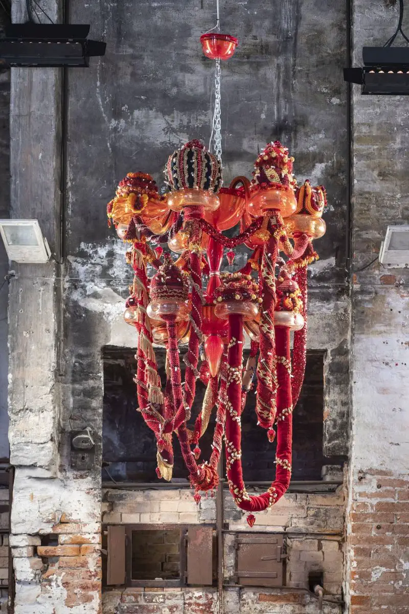 In unterschiedlichen Höhen baumeln dicke Stoffgirlanden in Rot und Gold sowie gehäkelte Accessoires. Verziert ist dieser besondere Kronleuchter mit Perlen und Elementen aus rot, orange und gelb gefärbtem Muranoglas, obenauf sitzen üppig geschmückte Kronen: Das von Joana Vasconcelos gestaltete Kunstwerk „Rubra“ zählt zu den Höhepunkten der insgesamt 31 zeitgenössischen Arbeiten 13 internationaler Künstlerinnen, die in der Ausstellung „The Sky’s the Limit“ zu bestaunen sind.