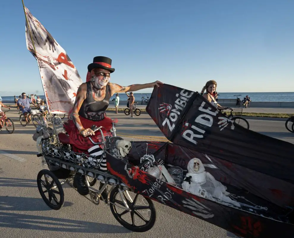 Zombies auf Fahrrädern? Dieses kuriose Spektakel können Besucher am 22. Oktober 2023 in Key West bestaunen oder sogar Teil der riesigen Parade werden. Im vergangenen Jahr nahmen bereits über 7.000 kostümierte und geschminkte Untote daran teil. Die gemütliche, circa sechs Kilometer lange Strecke führt entlang des South Roosevelt Boulevard mit tollen Aussichten auf den Ozean und anschließend weiter in die Innenstadt von Key West.
