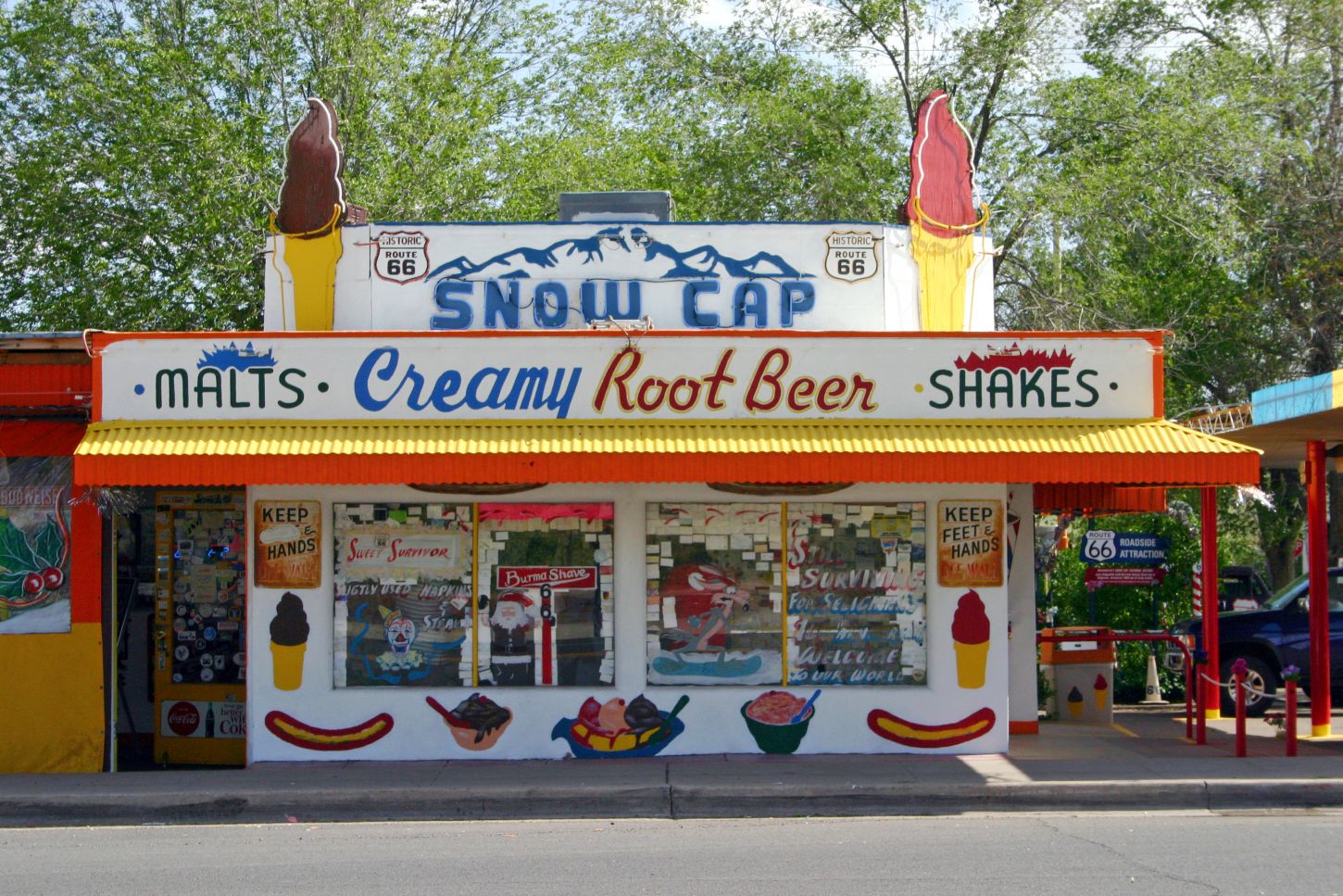 Heute finden die Besucher im Historic General Store alle erdenklichen Route-66-Souvenirs. Sie können auf einen Milkshake im legendären Delgadillo’s Snow Cap Drive-in einkehren und urige Übernachtungsmöglichkeiten in gemütlichen Hütten finden oder ihr eigenes Zelt aufbauen.