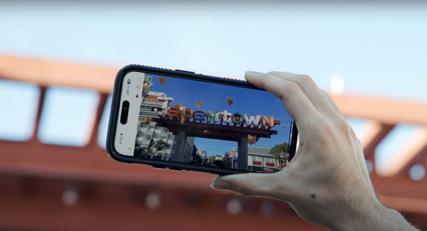 Besucher von Japantown scannen am Schaufenster des Geschäfts „Paper Tree“ einen QR-Code, um das kostenlose Origami-Abenteuer auf ihren Smartphones zu beginnen. Während sie durch die Buchanan Street schlendern, scheinen farbenfrohe rote und weiße Objekte aus Papier „in der Luft zu schweben“. Je nach Standort des Benutzers kommt auf dem Smartphone immer wieder ein neues überlebensgroßes Origami-Diorama zum Vorschein.