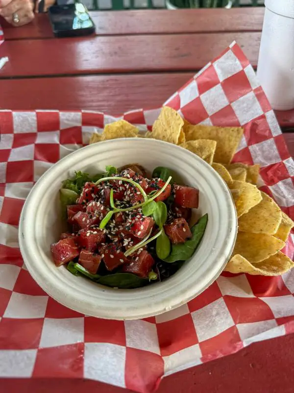 Ich wählte den Queen Anne's Revenge Tuna Poke, eine kreative Hommage an den Piraten Blackbeard – frischer Thunfisch in Würfeln, mariniert mit Soja, Sesam und einem Hauch von Schärfe, serviert mit Avocado und Reis. Es war leicht, erfrischend und hatte einen rohen, ozeanischen Kick. Die Portionen sind großzügig, die Preise fair (um die 20-30 Dollar pro Gericht), und es gibt auch Sandwiches, Suppen wie Clam Chowder oder Shrimp Boil für den kleinen Hunger. Vegetarische Optionen sind begrenzt, aber Salate und Beilagen wie gegrilltes Gemüse werden angeboten. Tipp: Kommt hungrig, und probiert die hausgemachten Saucen – die Cocktail-Sauce hat einen scharfen Twist.