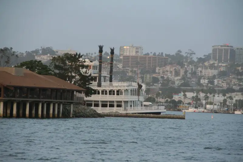 Trotz ungemütlichen Wetters trauten wir uns doch ab und zu nach oben, um die wichtigsten Aussichtspunkte San Diegos nicht zu versäumen. Das Essen wurde dieses Mal nicht in Buffetform, sondern als Dreigängemenü serviert, was wir als sehr positiv empfanden. Neben Salat gab es Hühnchen, Steak und New York Cheesecake. Die Portionen waren reichlich und auch geschmacklich gab es absolut nichts auszusetzen. Für ein paar Dollar mehr gab es die Möglichkeit, das Menü zu variieren, was aber unserer Meinung nach eigentlich nicht nötig ist, außer gewisse Komponenten entsprechen nicht dem eigenen Geschmack. Die angebotenen Weine waren solide und die Preise moderat. Durst mussten wir also auch nicht leiden.