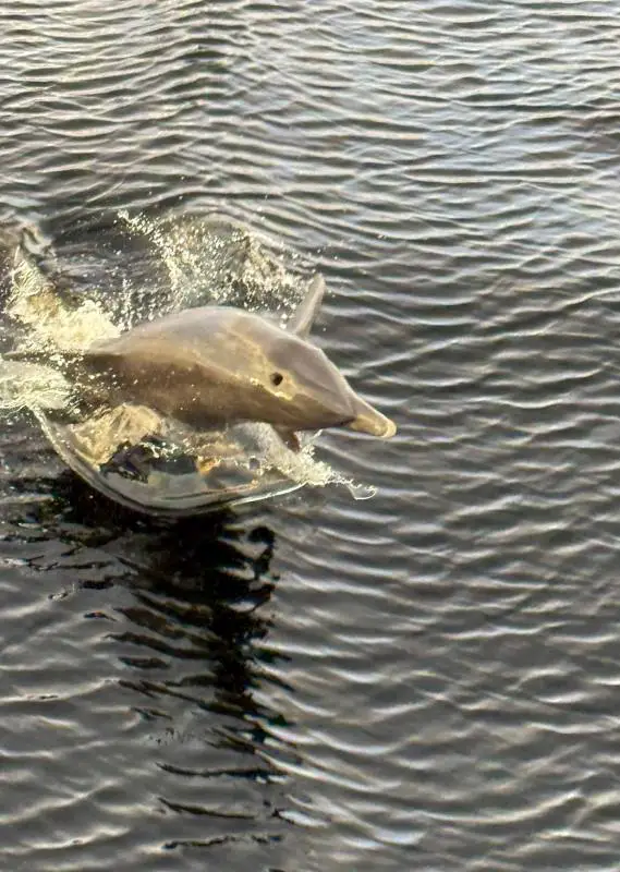 Pünktlich legten wir ab und fuhren hinaus in den Golf. Der Captain gab eine lockere, informative Erzählung zur Geschichte der Region – von Ponce de León, der hier vor über 500 Jahren landete, bis zur modernen Waterfront mit ihren luxuriösen Häusern in Punta Gorda und Port Charlotte. Wir fuhren vorbei an Mangroveninseln, wo Pelikane und Reiher nisteten, und hielten Ausschau nach Delfinen. Tatsächlich tauchten kurz darauf ein paar auf: Sie schwammen neugierig neben dem Boot her, sprangen aus dem Wasser – ein toller Moment, den wir schon ein paarmal in Florida erlebt haben, der aber nie langweilig wird.