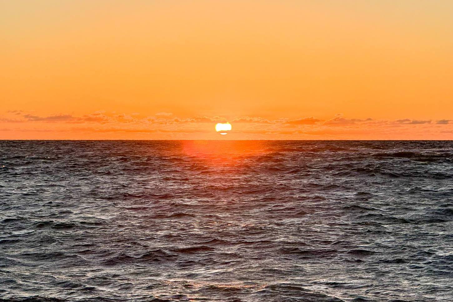 Und dann der Höhepunkt: Der Sonnenuntergang über dem Golf. Das Licht taucht den Himmel in Orange, Pink und Gold, spiegelt sich im Wasser – traumhaft! Wir haben sogar auf den berühmten „Green Flash“ gehofft, den kurzen grünen Blitz am Horizont, den man manchmal sieht. Obwohl er sich diesmal versteckt hielt, war es ein perfekter Abschluss.