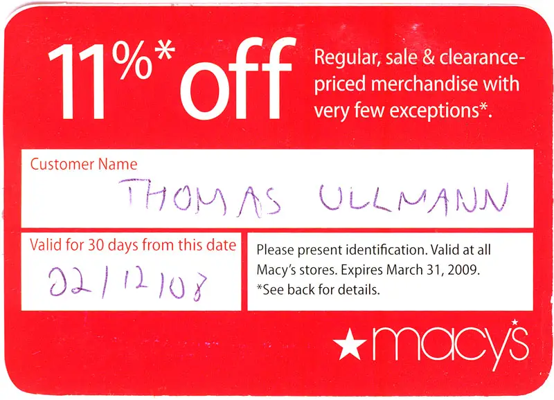 Bei Macy's sollte man sich auf jeden Fall kostenfreie Rabattkarte an der Kundeninformation (Customer Service) geben lassen. Man muss lediglich nachweisen, dass man aus einem anderen Bundesstaat oder dem Ausland kommt. Sie ist 30 Tage in allen Macy's Filialen der USA gültig und man erhält nochmal 11 % Rabatt auf fast alle Artikel (ausgenommen Möbel, Teppiche, Parfüm und Kosmetik), auch auf bereits reduzierte Ware.