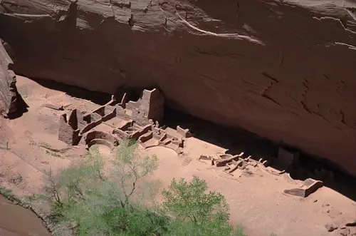 Das National Monument besteht eigentlich aus zwei Canyons, die in Form eines "V" zusammenlaufen. Der südlichere heißt Canyon de Chelly, der andere Canyon del Muerto (d.h. Canyon der Toten). Er erhielt seinen Namen im Jahre 1882, als man bei einer Expedition in diesem Canyon Überreste von Grabstätten vorgeschichtlicher Indianer fand. Beide Canyons blicken auf eine lange und zum Teil unrühmliche Vergangenheit zurück. Bereits etwa 350 n.Chr. siedelten dort die "Korbmacher", die in runden Grubenhäusern lebten. Erst in der Zeit zwischen 700 und 1300 n.Chr. entstanden die Pueblos (span. Wort für Dorf) unter den Felsklippen. Die Jahre nach 1.300 waren durch lang anhaltende Dürren gekennzeichnet. In dieser Zeit wurden sehr viele Siedlungen im Südwesten der USA verlassen. Erst um 1700 n.Chr. besiedelten wieder Indianer den Canyon de Chelly dauerhaft. Es waren die Navajos, die bisher im Norden New Mexicos gelebt hatten.
