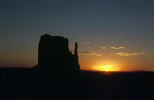 Berühmt wurde das Monument Valley durch viele Western, die der Regisseur John Ford hier drehte und auch der Marlboro Reklame diente es als Kulisse. Die weite Ebene, aus der einzelne bis zu 300 m hohe Felsformationen wie Türme, Nadeln, Kuppen und langgestreckte Tafelberge emporragen, liegt etwa 1600 m über dem Meeresspiegel. Über 1,5 Mio. Jahre benötigten Wasser und Wind, um das weiche Gestein abzutragen und diese Formationen zu hinterlassen. Besonders stimmungsvoll wirkt der rotglühende Sandstein in der Abendsonne oder wenn die Felstürme bei Sonnenaufgang tolle Silhouetten gegen den sich aufhellenden Himmel bilden.