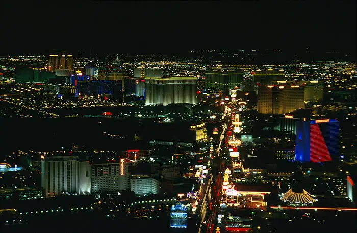 Einen der schönsten Aussichtspunkte auf die Stadt bietet der fast 300 Meter hohe Stratosphere Tower am nördlichen Ende vom "Strip". Entweder man begibt sich auf die Aussichtsplattform oder man hat in luftiger Höhe eine Tischreservierung im Restaurant. Ein guter Zeitpunkt ist ca. eine Stunde vor Sonnenuntergang, wenn auf dem "Strip" so nach und nach die Neonreklamen erstrahlen. Ist es erst einmal dunkel, liegt einem die farbenprächtige Kulisse des Spielerparadieses zu Füßen, ein spektakuläres Panorama.